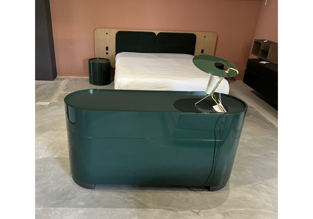Nadir conçue par Alf Dafrè est une commode à 3 tiroirs réalisée avec une base en métal et un corps et des façades laqués vert forêt brillant.
