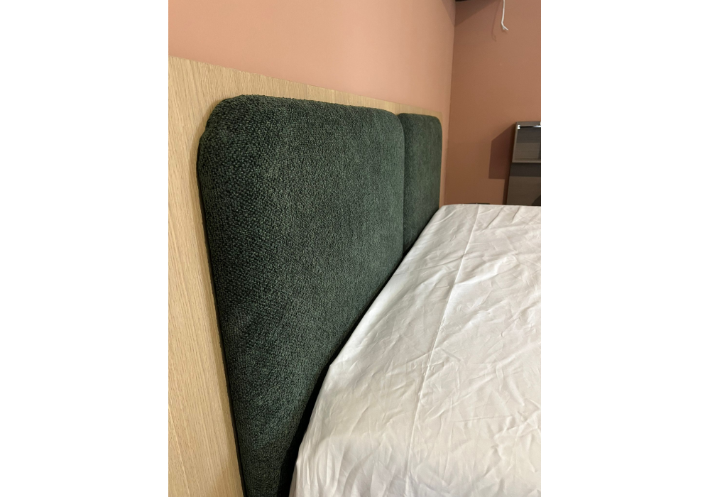 Grand Voile conçu par Alf DaFrè est un lit avec une tête de lit finition chêne chanvre et un coussin rembourré recouvert de tissu. L'éclairage intégré comprend une bande LED derrière la tête de lit et une barre LED sur le sommier. Il est équipé d'un sommier orthopédique sans pieds et d'un système électrique avec ports USB de chaque côté.