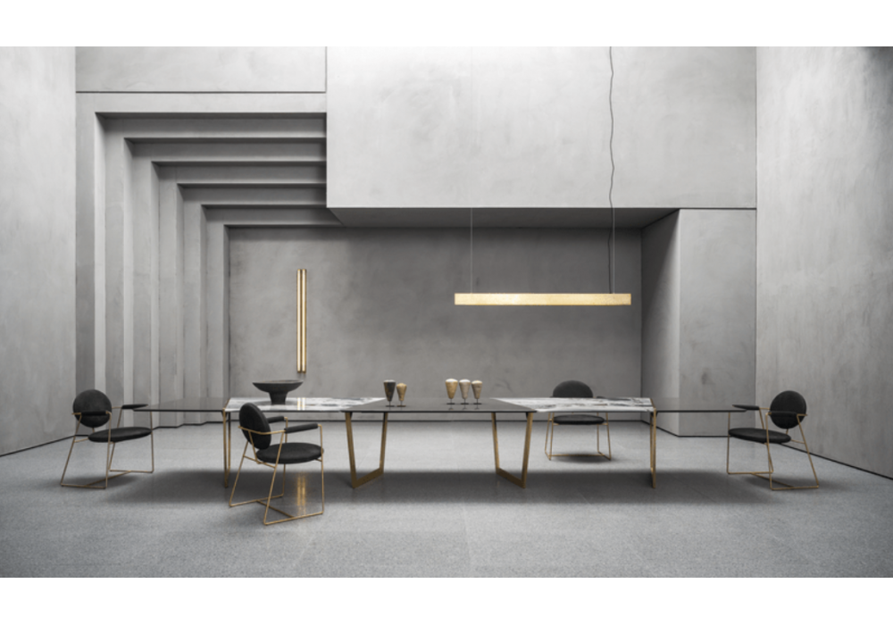 Blade conçue par Baxter P. pour Baxter est une suspension LED avec une structure en laiton vieilli.