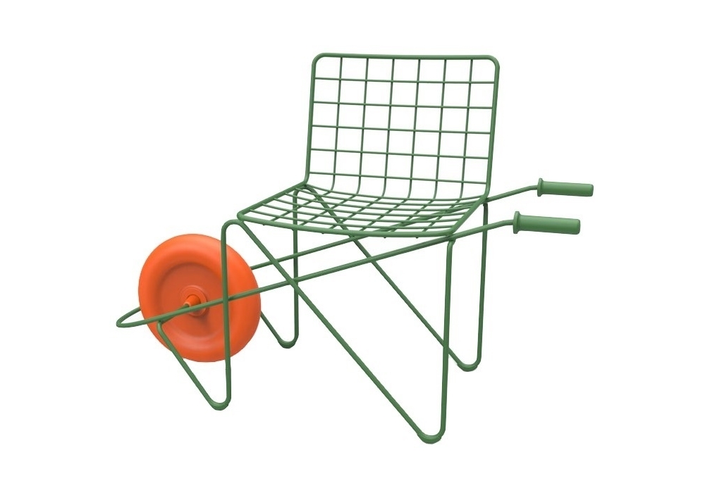 Trotter conçue par Rogier Martens pour Magis Me Too est une chaise pour enfants avec structure en tige d'acier peinte en vert ou jaune. Roues et boutons en polypropylène.