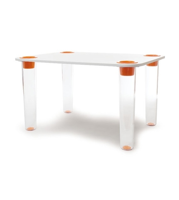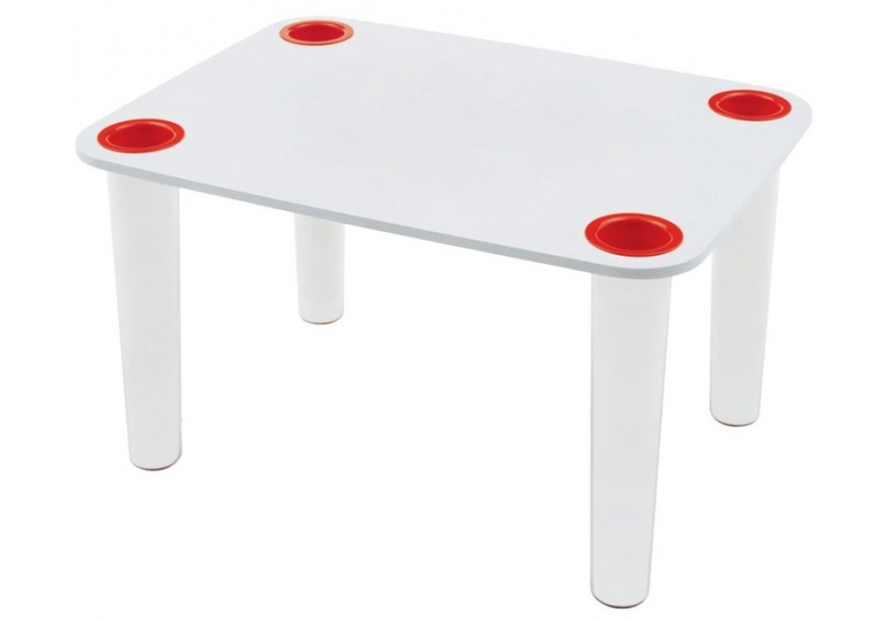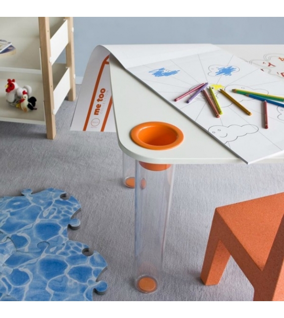 Little Flare conçue par Marcel Wanders pour Magis Me Too est une table pour enfants avec plateau en MDF recouvert de feuille de polymère, perforé pour loger les plumiers. Pieds en polycarbonate transparent neutre. Disponible avec ou sans plumier en ABS.