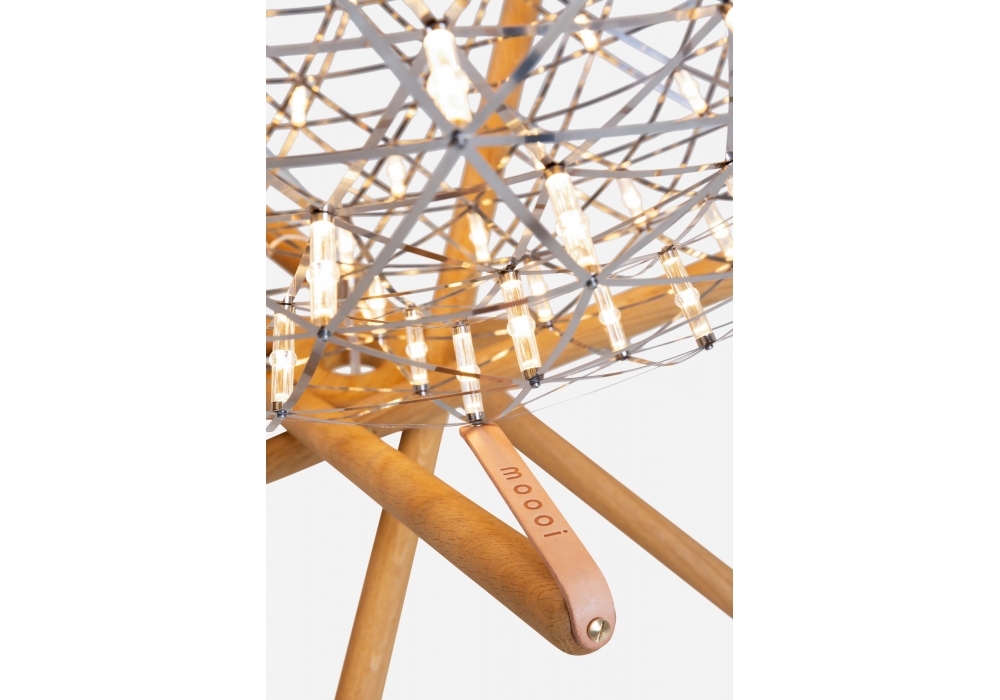 Raimond II Tensegrity conçu par Raimond Puts pour Moooi est un lampadaire LED dimmable avec sphère en acier inoxydable avec lentilles en PMMA, pieds en bois et sangles en cuir. Câble transparent.