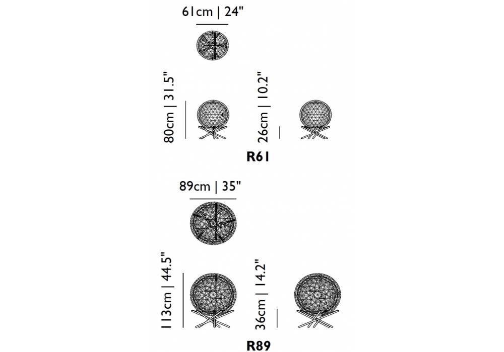 | Dimensions | R61: Ø 61 cm x H 80 cm; R89: Ø 89 cm x H 113 cm. |