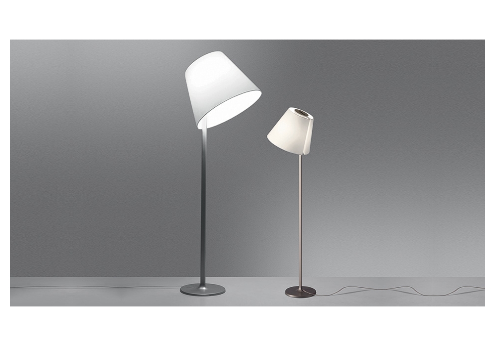 Melampo Mega conçu par Adrien Gardère pour Artemide est un lampadaire à base circulaire et tige tubulaire en zamak et alliage d'aluminium. L'abat-jour est en satin avec support en technopolymère et abrite une source lumineuse LED.