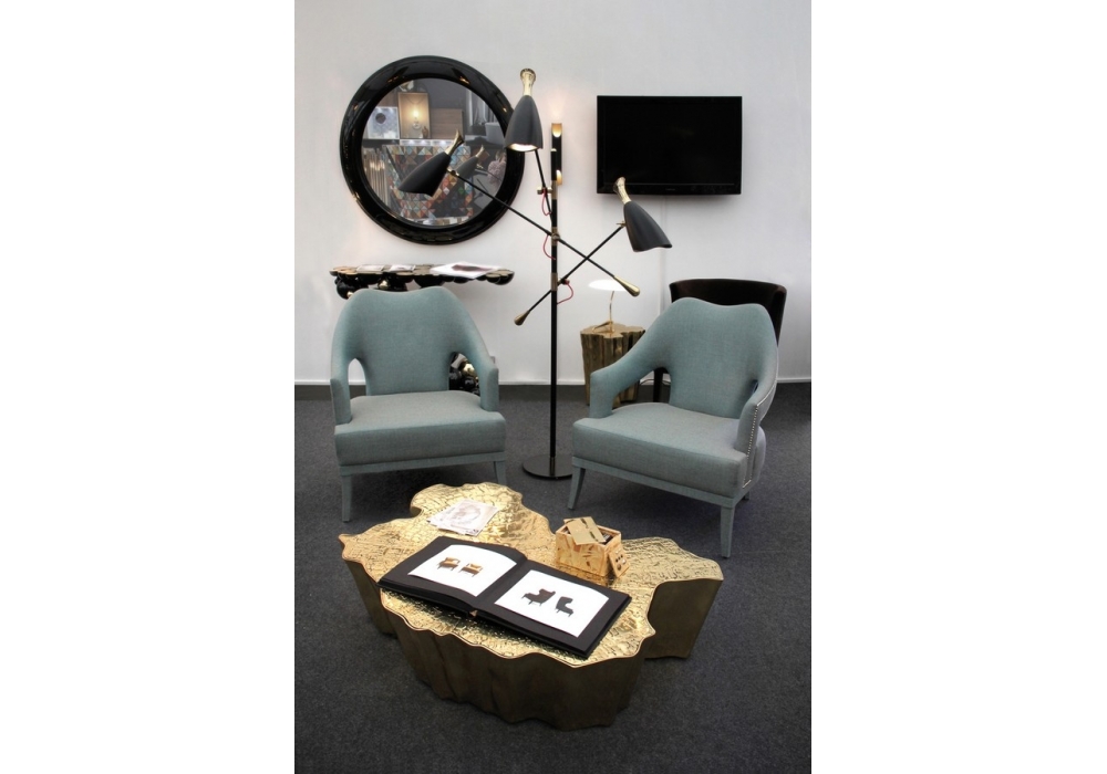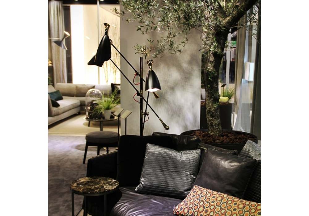 Duke conçu par DelightFULL est un lampadaire en laiton composé de trois bras et chaque abat-jour en forme de cône est dirigé par un bras en laiton et son contrepoids.