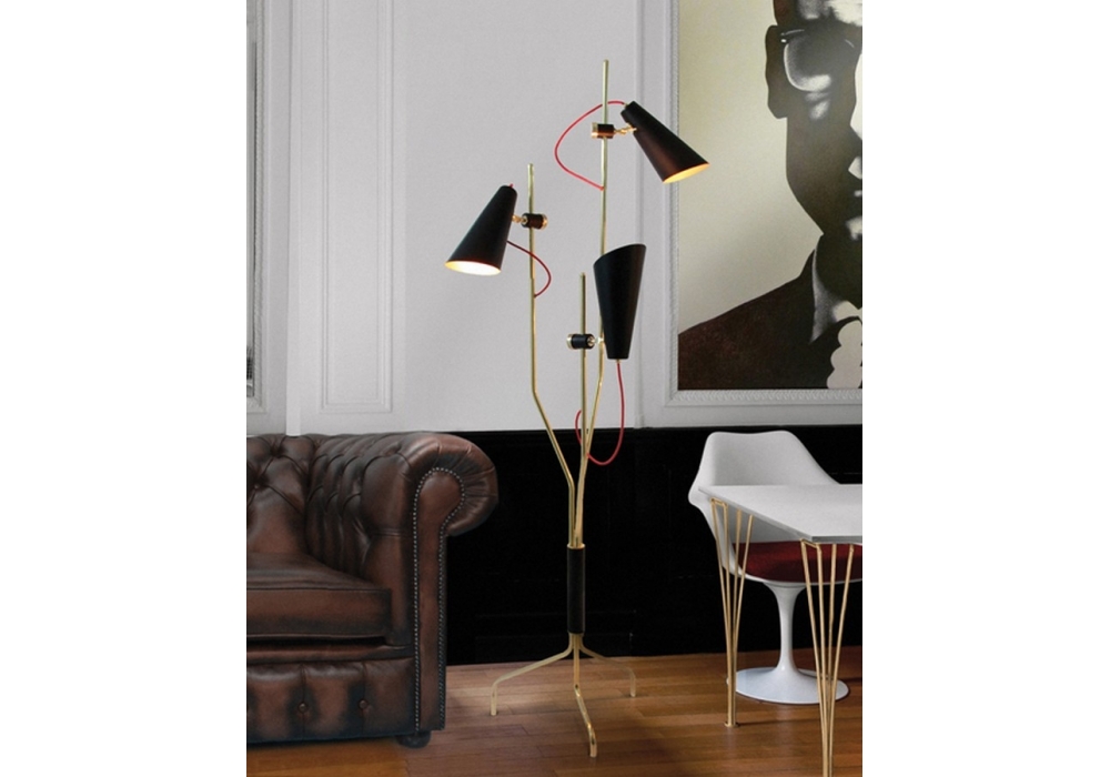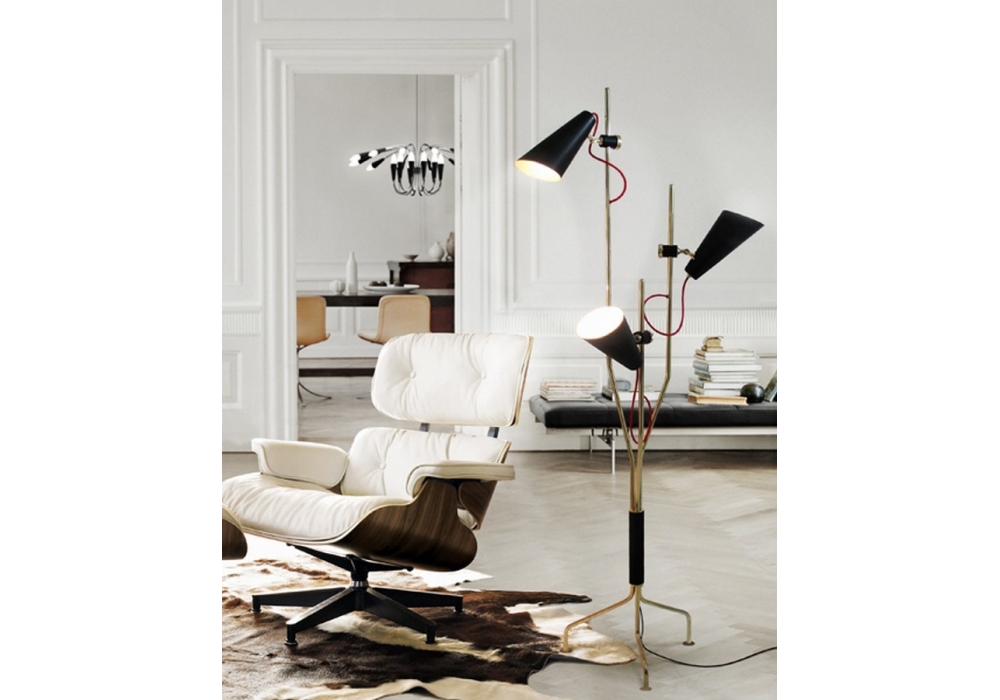 Evans conçu par DelightFULL est un lampadaire avec trois diffuseurs orientables, finitions en peinture en poudre noir mat et or.