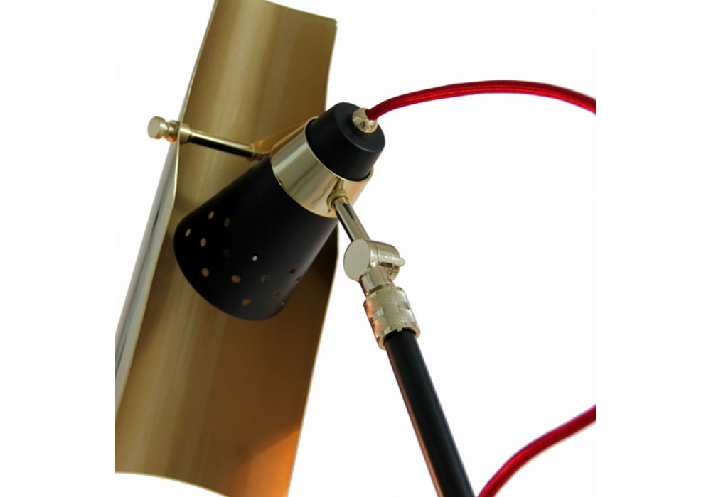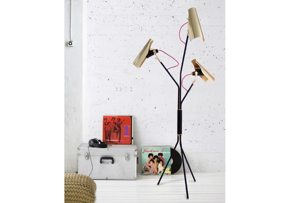 Jackson conçu par DelightFULL est un lampadaire fabriqué sur mesure en laiton, il comporte trois abat-jour flexibles avec des finitions noir mat et plaqué or et des fils de tissu rouge.