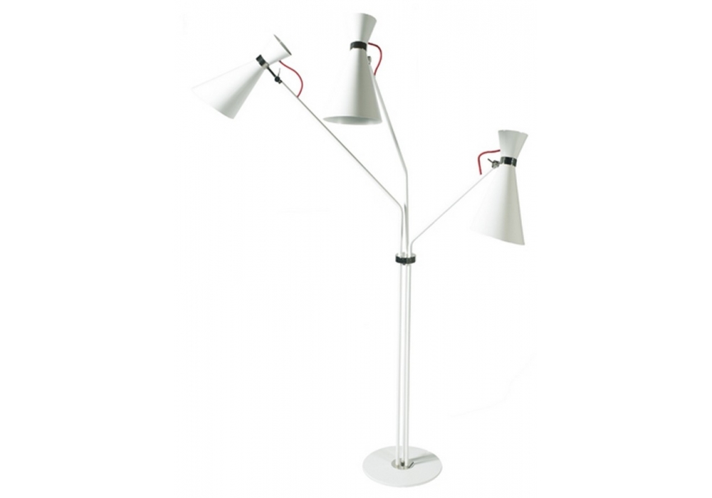 Simone conçu par DelightFULL est un lampadaire est un lampadaire articulé à trois lumières avec abat-jour blanc brillant et structure en laiton faite à la main.