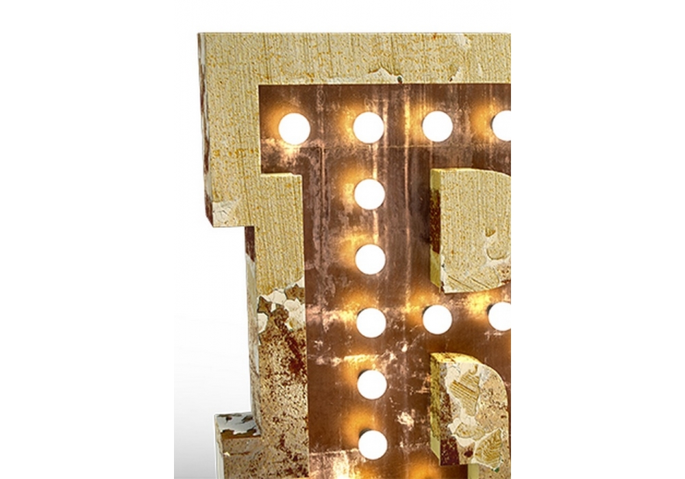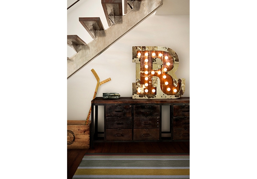 Graphic Collection - Letter R is a lamp designed by DelightFULL. This lamp will bring style to any project, whether modern or rustic. The shabby looks of this lamp are no reason to be ashamed, carefully torn and worn rusty pieces of steel shaped by our craftsman give each one of these letters a unique soul. One is never like the other. The 21 bulbs add the finishing touch of glamour to this very graphic lamp. You can either put it on the ground or the wall. Graphic lamp R will give your project an urban industrial feeling.