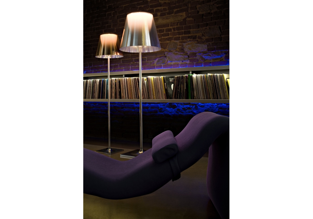 Ktribe F3 conçu par Philippe Starck pour Flos est un lampadaire à lumière diffuse au design raffiné et moderne. Sa structure se compose d'une base, d'une tige de support et d'un support diffuseur en alliage de zamak moulé sous pression, poli et chromé, recouvert d'une tôle d'acier galvanisée. Le diffuseur interne et le support de la douille sont en polycarbonate opale moulé par injection. Le câble est équipé d'un variateur électronique permettant de régler l'intensité lumineuse par paliers. Ampoule non incluse.