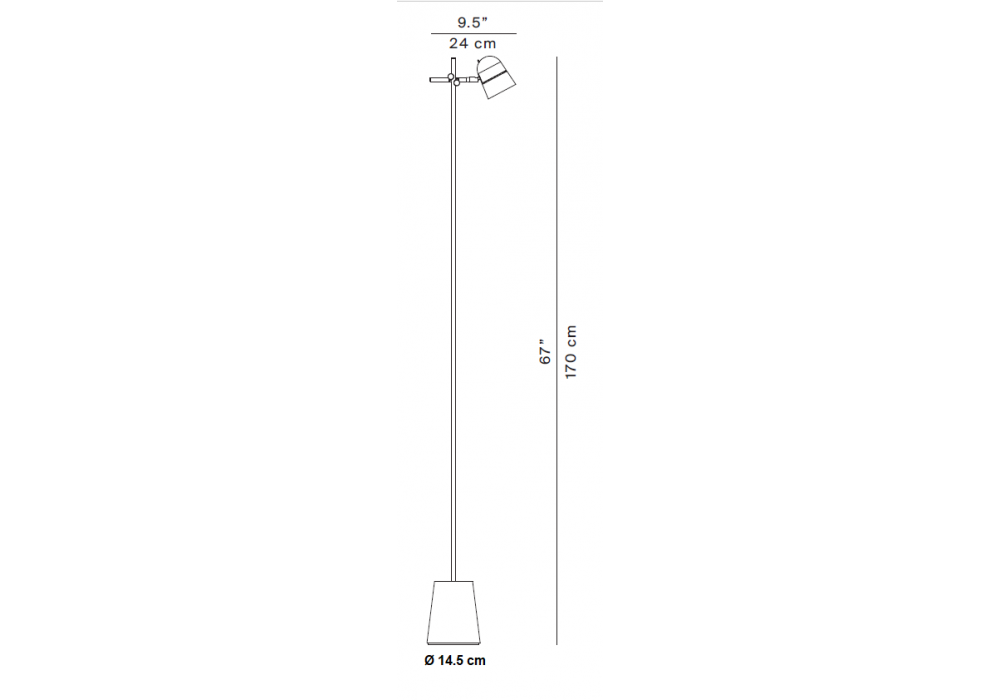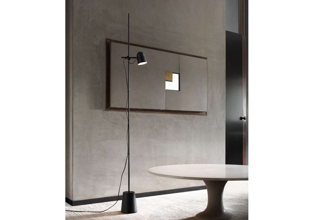 Counterbalance Floor conçu par Daniel Rybakken pour Luceplan est un lampadaire avec structure en acier peint en noir et réflecteur à dôme en aluminium orientable réglable en hauteur grâce à un mécanisme coulissant le long de la tige.