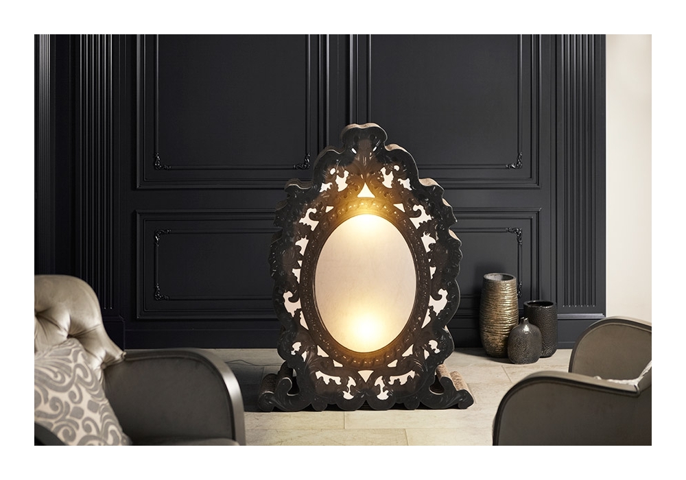 Dorian designed by Kubedesign is a decorative ‘Rococò Mirror’ floor lamp. Printed methacrylate diffuser at front and printed shockproof back. For use with two E27 bulbs (included).