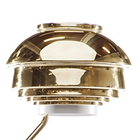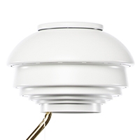 The A808 Floor Lamp designed by Alvar Aalto for Artek. Shade polished brass or white painted steel. Base and stand covered with black leather. Upper part of the stand polished brass.