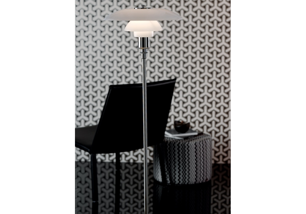 PH 4½-3½ Glass conçu par Poul Henningsen pour Louis Poulsen est un lampadaire avec base circulaire en laiton repoussé et tige en acier tubulaire, tous deux chromés. Les diffuseurs sont en verre opale blanc et protègent une source lumineuse LED ou halogène avec culot E27.