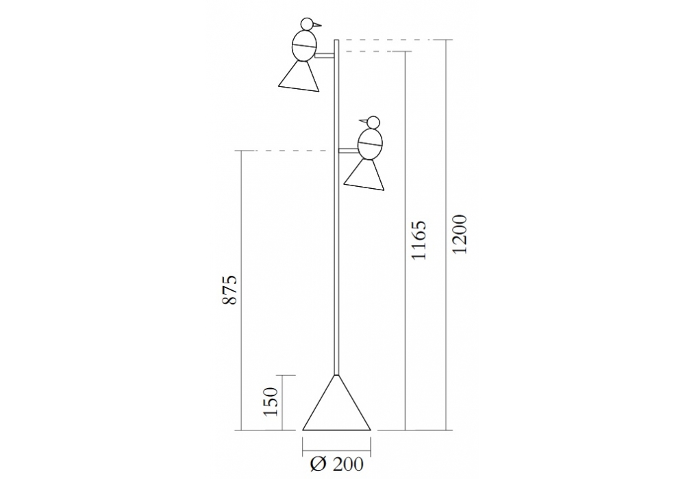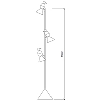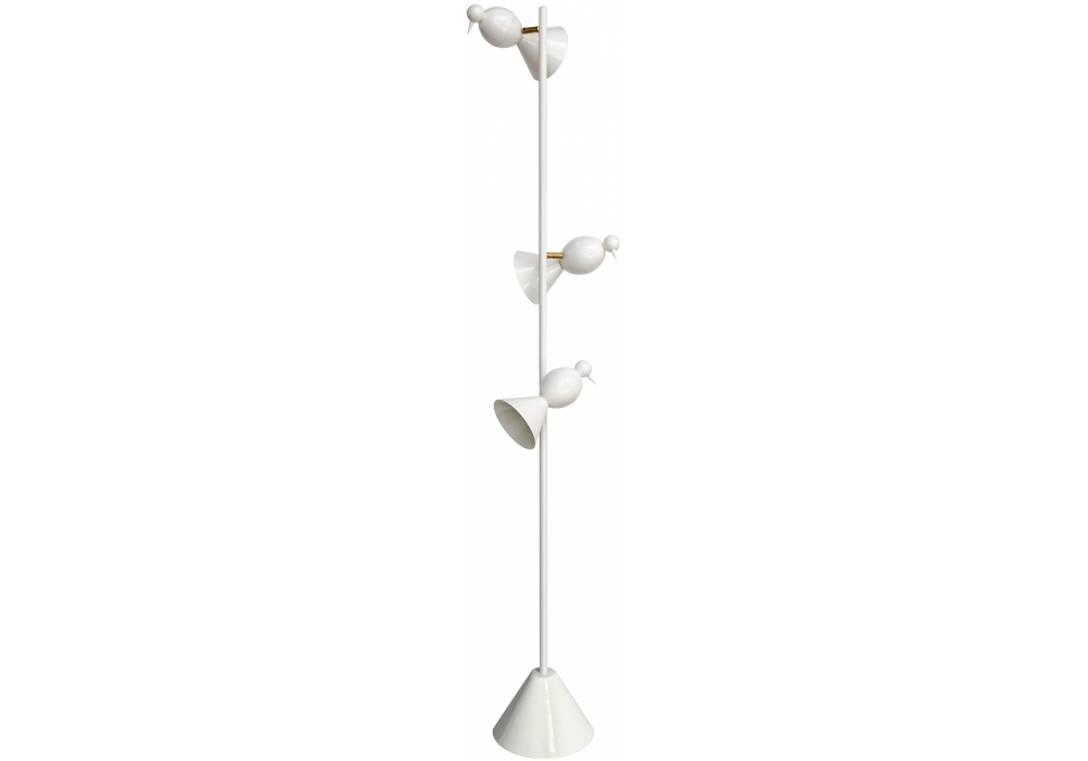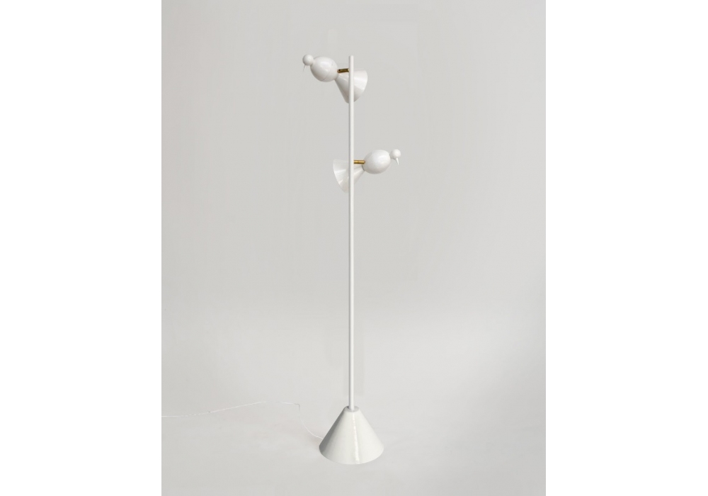The Alouette Standing Birds is a floor lamp produced by Atelier Areti. This joint allows the birds to move and rotate in various directions. Available in black or white. Material and fabrication: hand spun, powder coated steel and brass joint. Light bulbs not included.