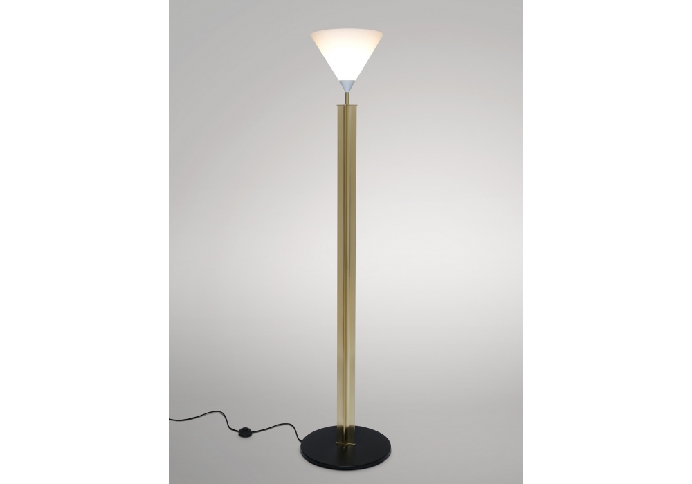 Column Cone est une lampadaire caractérisée par un cadre en laiton brossé et un abat-jour en forme de cône en verre. La base est en finition noire. Ampoule non incluse.