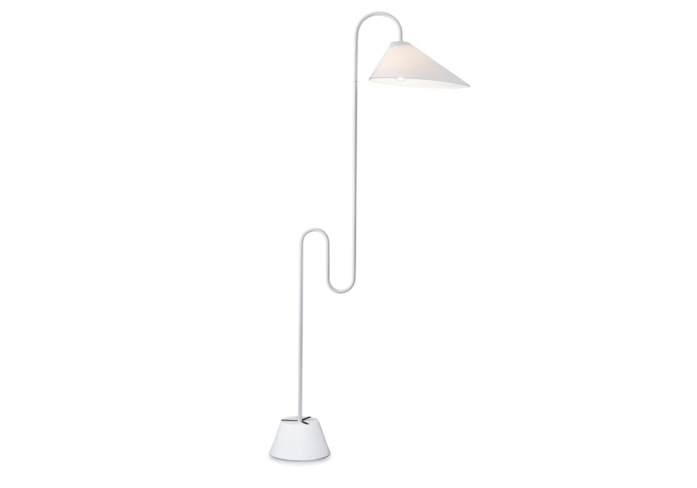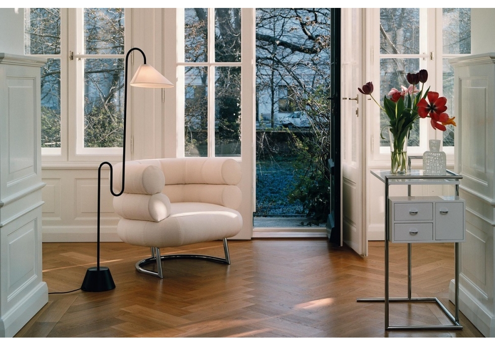Roattino conçu par Eileen Gray pour ClassiCon est un lampadaire avec base en tube d'acier et structure en forme de S, laqué noir ou blanc crème. La tête de lampe peut être pivotée horizontalement. Abat-jour en tissu blanc, contrecollé à l'intérieur. Interrupteur au pied, dimmable.