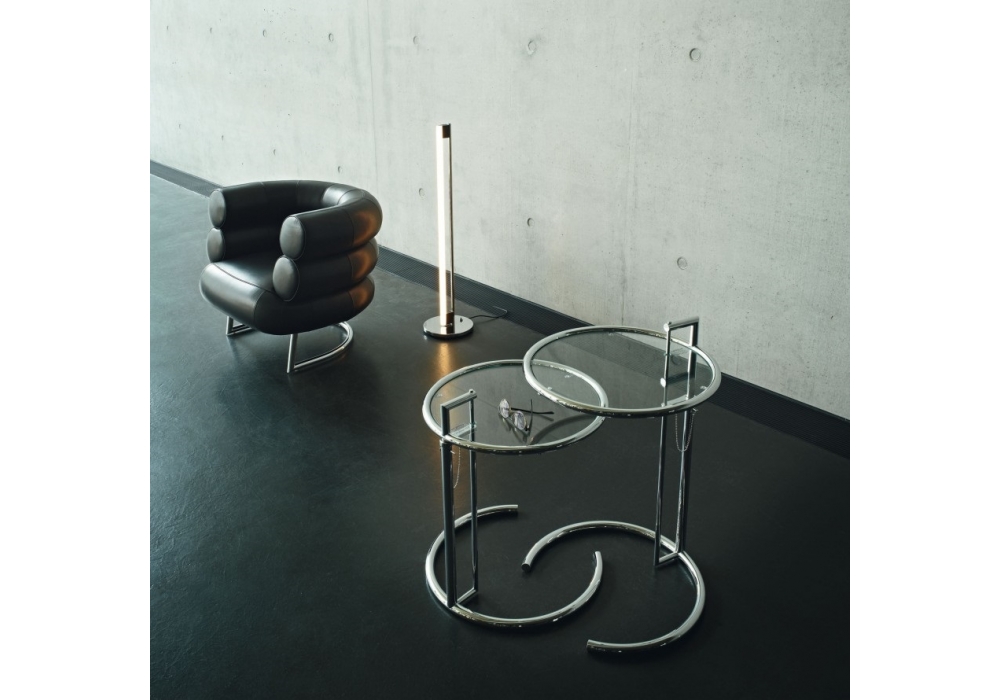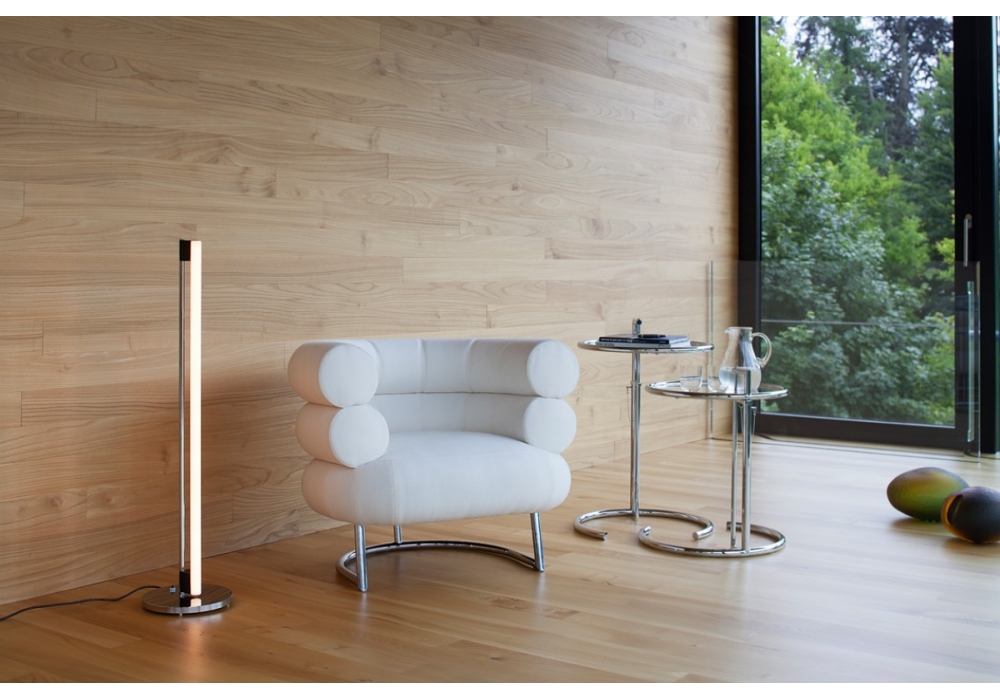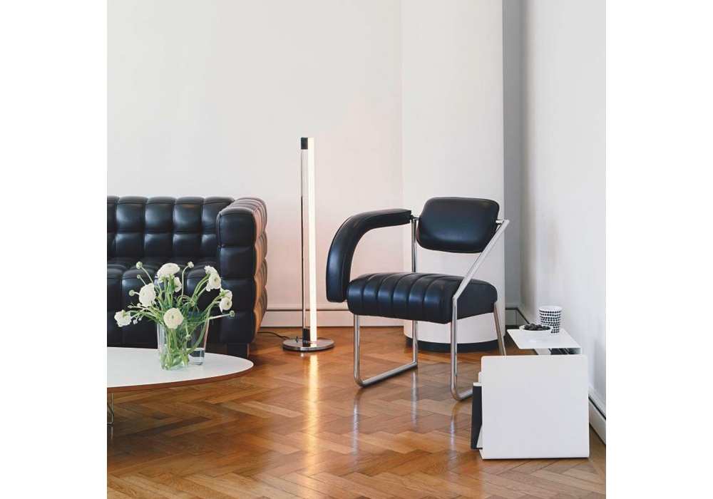 Tube Light conçu par Eileen Gray pour ClassiCon est un lampadaire avec structure chromé et douilles en matière plastique noir, interrupteur à pied.