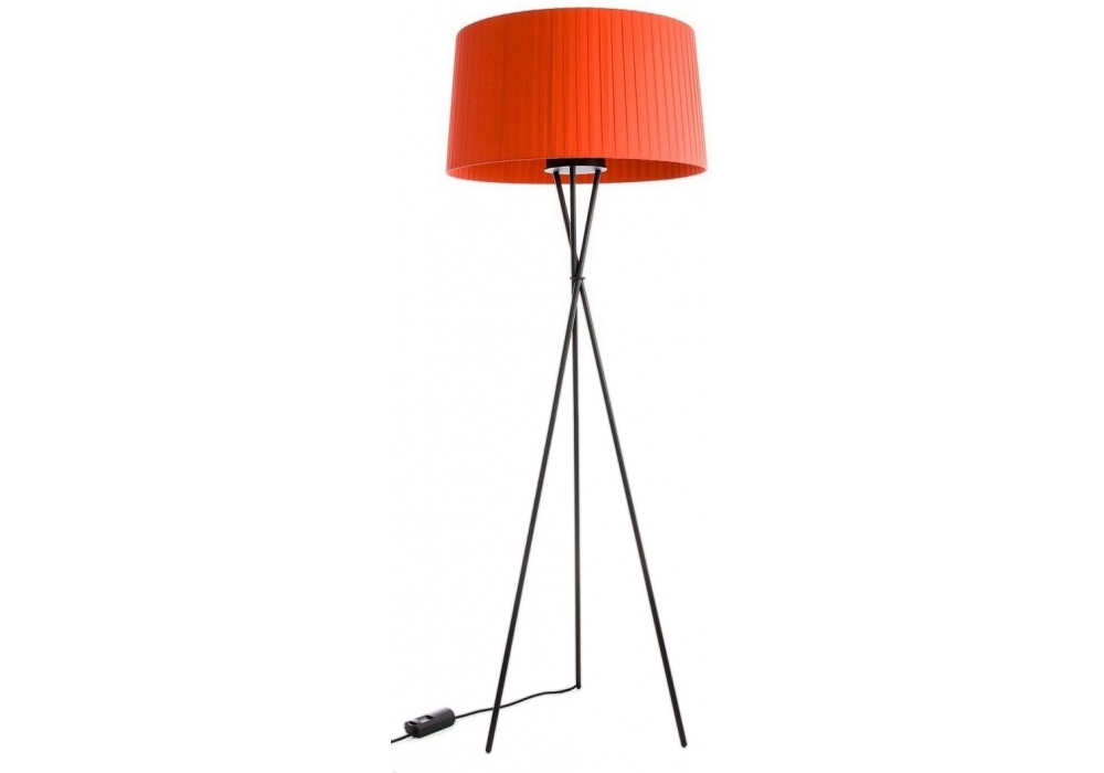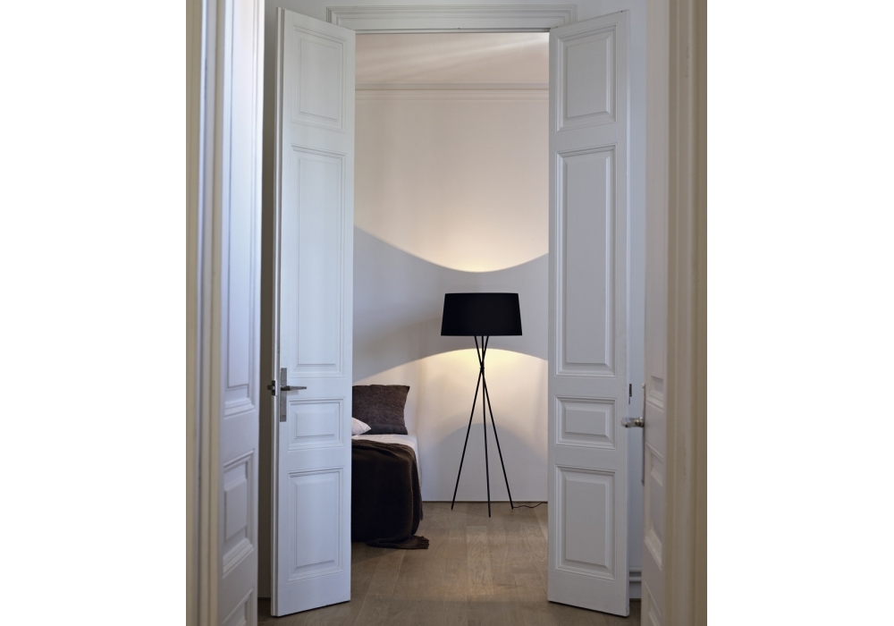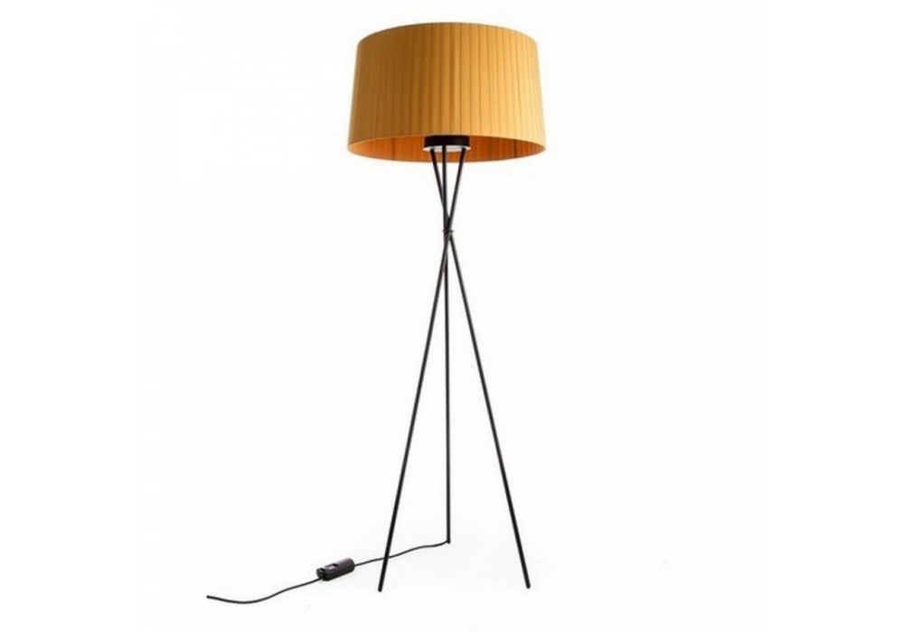 Tripode G5 conçu par Santa&Cole Team est un beau lampadaire avec structure en métal et abat-jour disponible en différentes finitions. Il s'agit ici d'un faisceau de trois tubes noirs unis, comme un jeu de baguettes chinoises, portant un vaste abat-jour enrubanné. Allumée, la lampe fournit beaucoup de lumière chaleureuse, et éteinte elle constitue une sculpture volumétrique dignifiant l’espace.