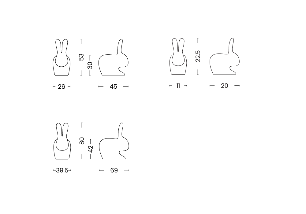 Rabbit conçue par Studio Job pour Qeeboo est une lampe portable rechargeable en polyéthylène. La source lumineuse adoptée est de type LED RVB gérable par télécommande. Le lapin est disponible en différentes tailles.