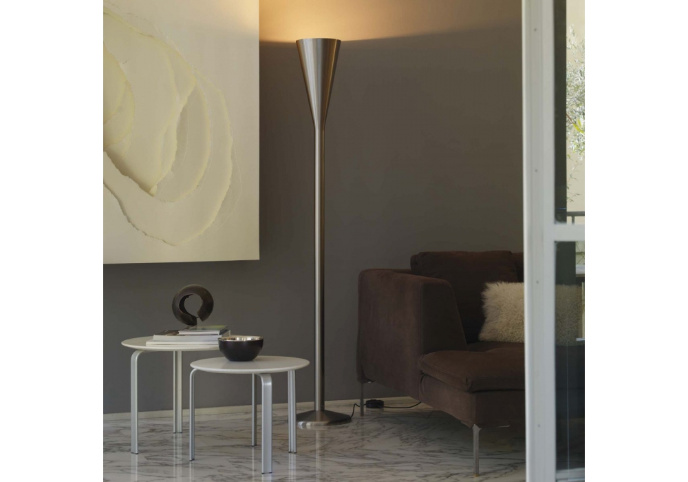Luminator LED conçu par Pietro Chiesa pour Fontana Arte est un lampadaire à lumière indirecte dimmable avec un bouton. Structure en métal nickelé satiné ou métal satiné. Cordon d'alimentation, gradateur et prise noirs. Disponible en différentes finitions.