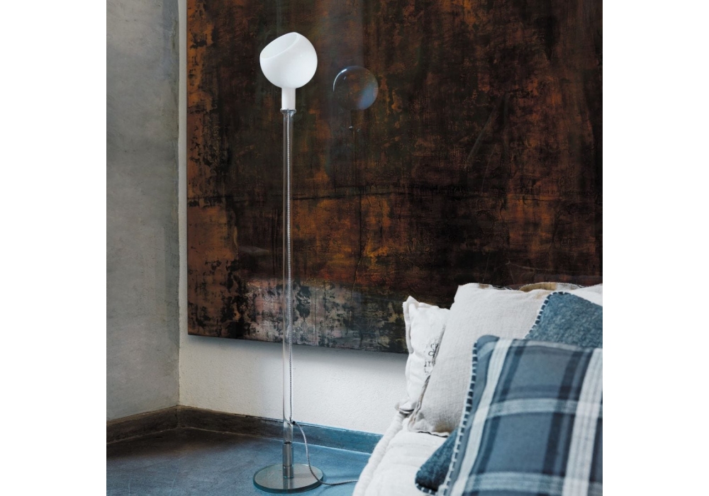 Parola conçu par Gae Aulenti & Piero Castiglioni pour Fontana Arte est un lampadaire à lumière diffuse dimmable avec interrupteur au sol coulissant. Structure et base entièrement en verre borosicato et greffe de base en métal chromé. Le diffuseur est sphérique en verre soufflé ambre ou blanc. Disponible en différentes finitions.