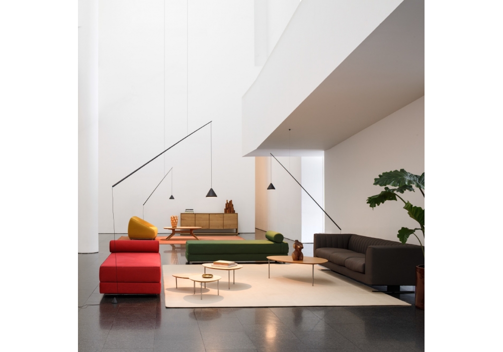 North conçue par Arik Levy pour Vibia est une lampe de sol/suspension avec tige en tube d'acier peint avec contrepoids en aluminium. L'abat-jour est en aluminium et adopte un diffuseur en méthacrylate qui protège une source de lumière LED avec interrupteur marche/arrêt. North est disponible en différentes finitions.