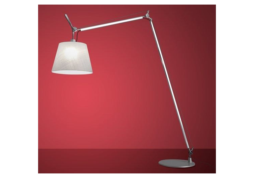 Tolomeo Maxi conçu par Michele De Lucchi & Giancarlo Fassina pour Artemide est un lampadaire avec base circulaire et structure à bras mobiles en acier et aluminium. L'abat-jour est réglable en papier parchemin et protège une source de lumière LED à intensité variable.