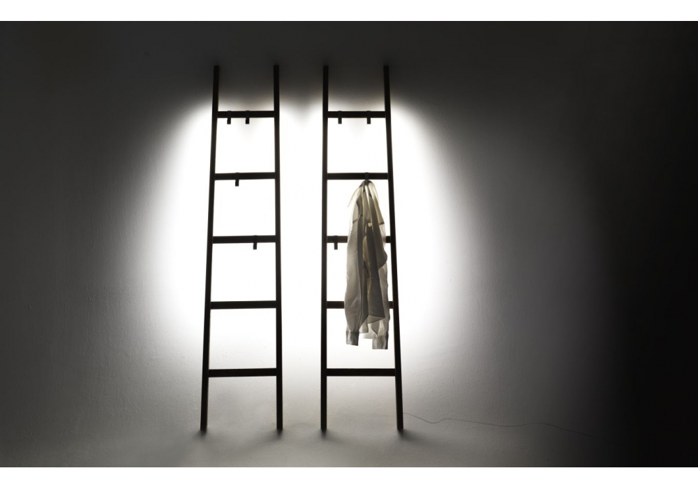 Alla Scala conçue par Claudio Bitetti pour Mogg est une lampe / cintre en bois de frêne massif, avec LED et 4 crochets inclus. Il peut être placé sur le mur ou autoportant s'il est positionné sur la plaque spéciale en acier poli miroir supplémentaire.