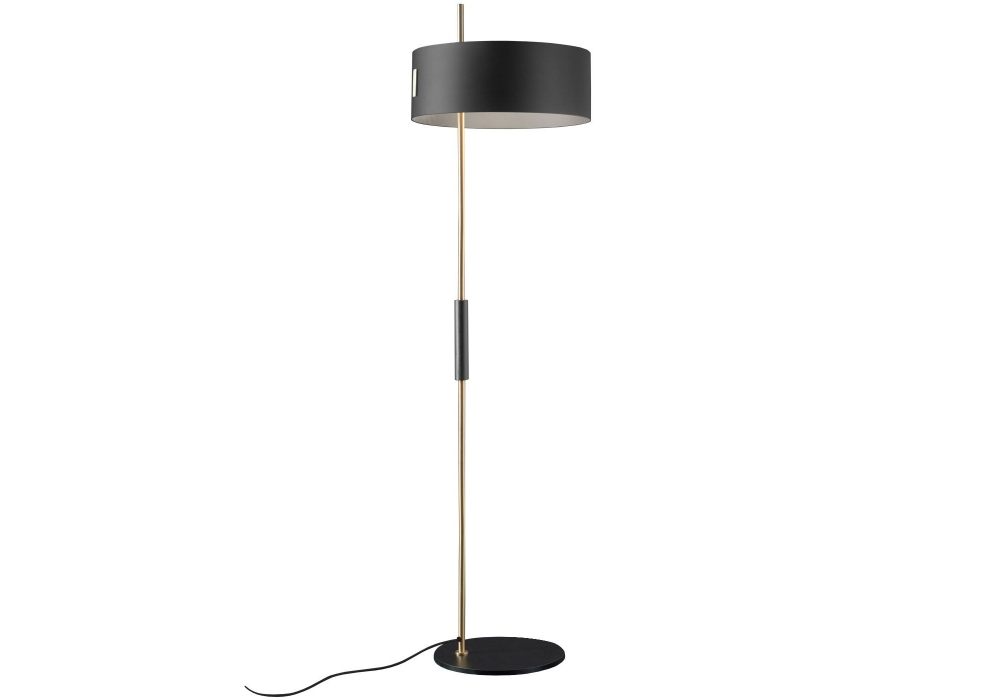 1953 conçu par Ostuni & Forti pour Oluce est un lampadaire entièrement en métal avec une base circulaire peinte en noir mat et une tige verticale de couleur or satiné. L'abat-jour est en métal noir mat avec un dessus en or satiné et abrite une source lumineuse.