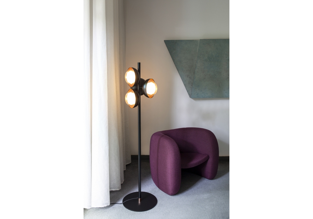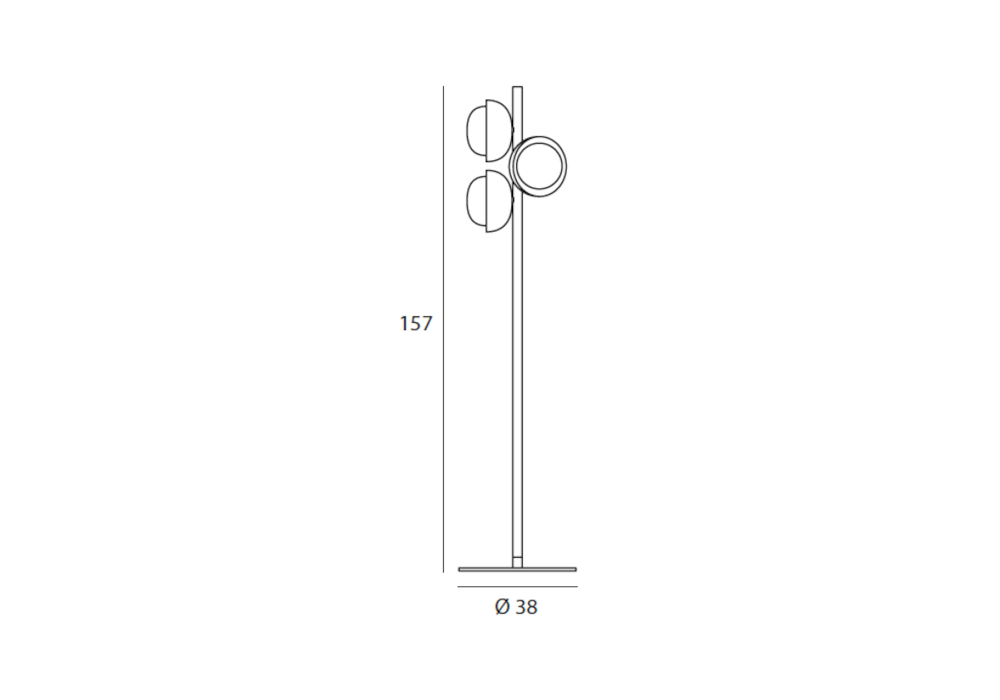554 Muse conçu par Corrado Dotti pour Tooy est un lampadaire avec structure en métal noir sable et double abat-jour en verre avec dôme interne de différentes finitions. Cette lampadaire est également disponible avec un variateur intégré sur le câble. Ampoule non incluse.