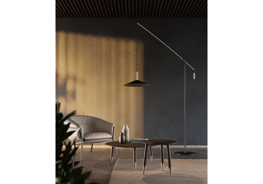 Altura conçu par Sommella & Anonima Luci pour Penta est un lampadaire avec structure en acier peint en noir mat. L'abat-jour est en aluminium peint en noir et utilise une source de lumière LED avec système de gradation sur le cordon d'alimentation.