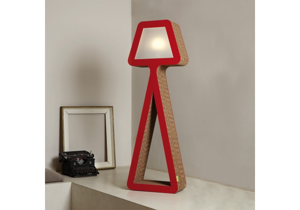 Biancaneve designed by Kubedesign is floor lamp of threedimensional cardboard. Lampshade made of polypropylene. Structure coated in white, black or red shockproof material.