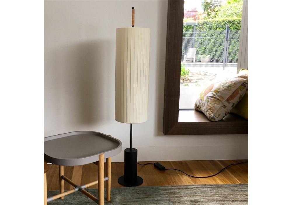 Dorica conçue par Jordi Miralbell et Mariona Raventós pour Santa&Cole est une lampadaire avec un abat-jour en coton, une structure métallique et une poignée en cuir. Elle est également disponible avec une base stabilisatrice.