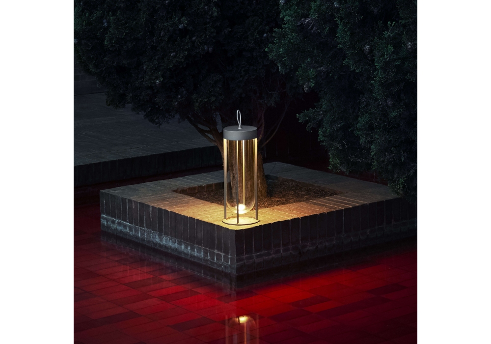In Vitro Unplugged conçu par Philippe Starck pour Flos est un lampadaire nomade doté d'une poignée de transport. Son driver dimmable est intégré au corps de l'appareil et son capteur tactile optique permet de régler l'intensité lumineuse sur 4 niveaux. Rechargeable via un câble Micro USB-C garantissant une émission continue jusqu'à 6 heures. Chargeur avec prises interchangeables. Driver et source lumineuse LED inclus.