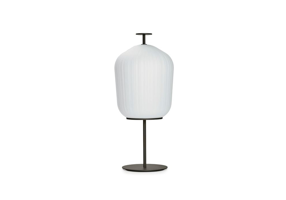 Plissée conçue par Sebastian Herkner pour ClassiCon est un lampadaire doté d'une structure en aluminium. Abat-jour en verre opale satiné blanc soufflé bouche à la surface plissée. Interrupteur poussoir intégré dans la partie supérieure de la structure. Patins en feutre noir.