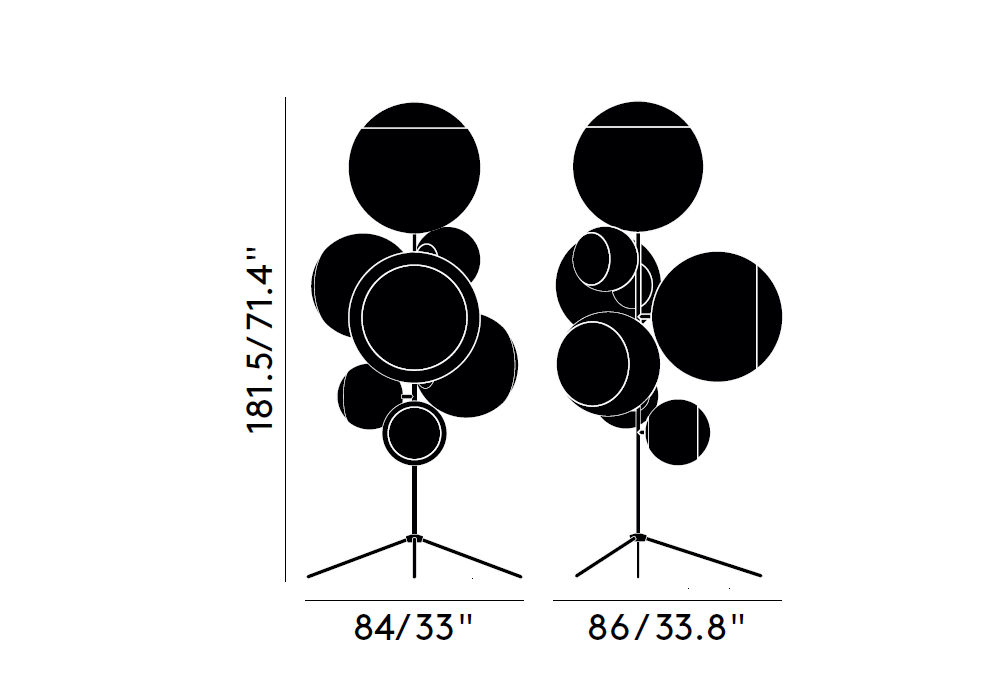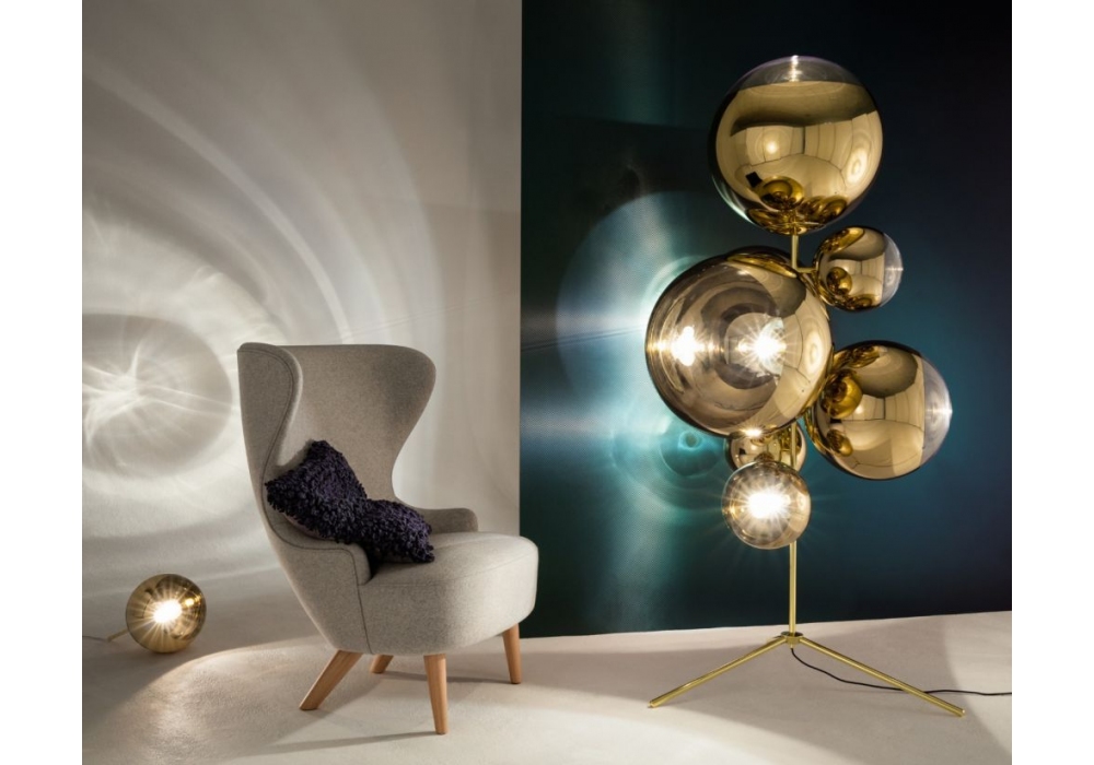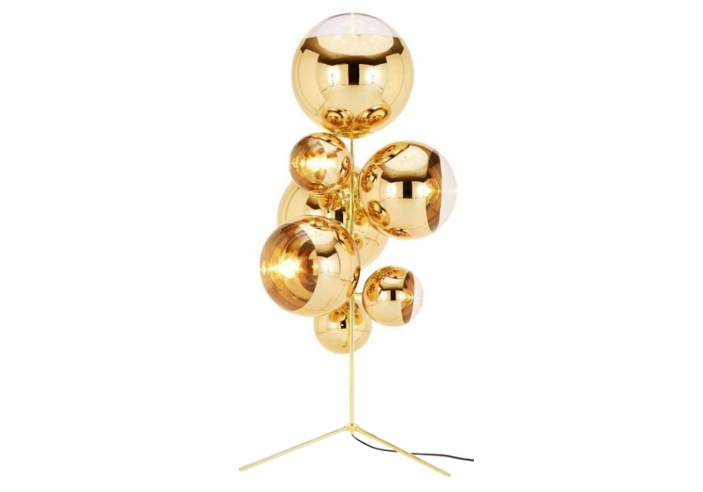 Mirror Ball Floor conçu par Tom Dixon est un lampadaire en acier et polycarbonate composé de 7 globes sphériques en miroir.