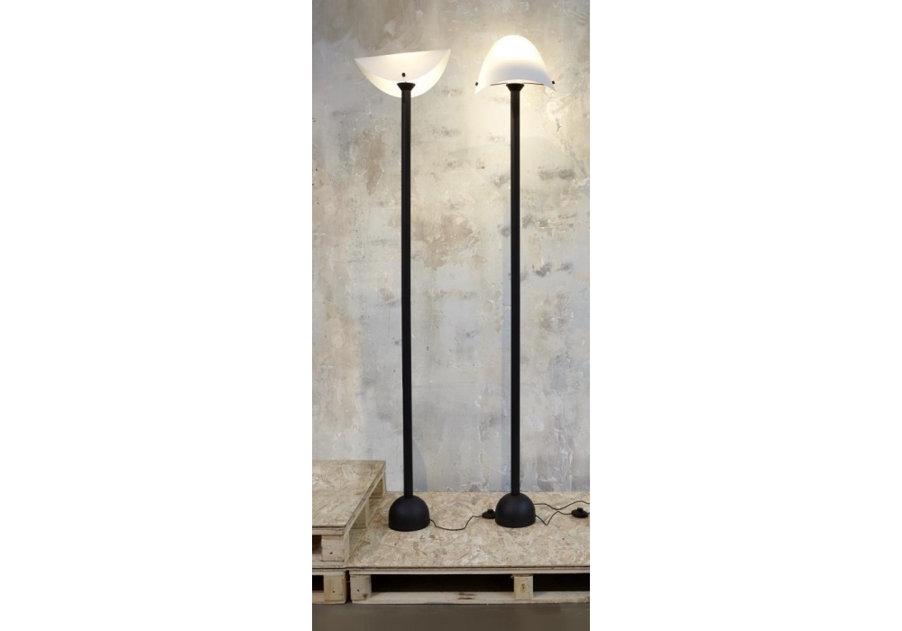 Courrier conçu par CP — RV pour Ligne Roset est un lampadaire avec une base métallique en forme de demi-sphère surmontée d'une tige métallique, finition laquée époxy noir satiné RAL 9011. Réflecteur orientable en PVC blanc translucide qui diffuse et réfléchit la lumière en fonction de l'orientation.