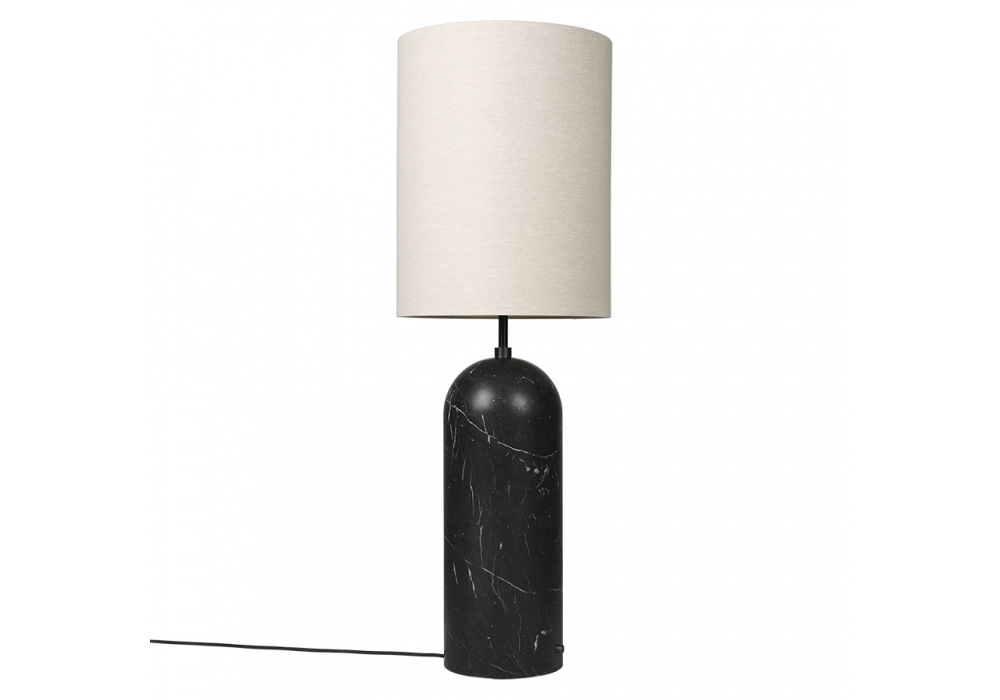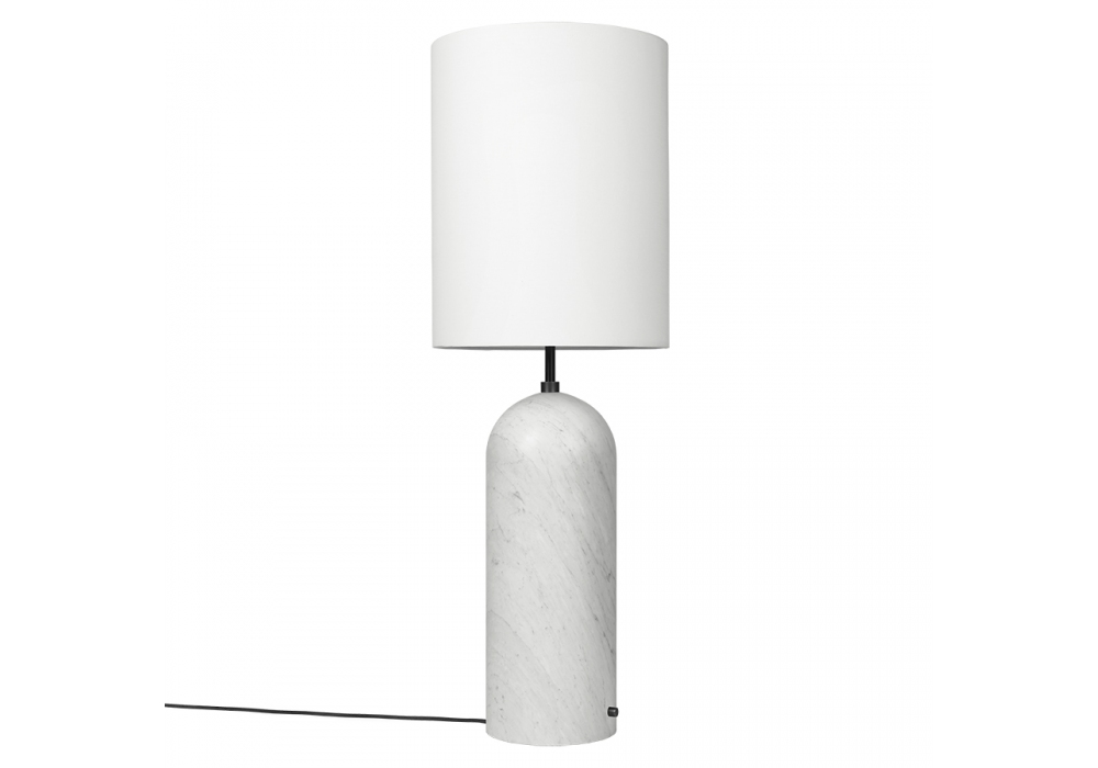 Gravity XL conçu par Space Copenhagen pour Gubi est un lampadaire composé d'une base en marbre et d'un abat-jour en toile. Il est disponible en deux tailles et en différentes finitions.