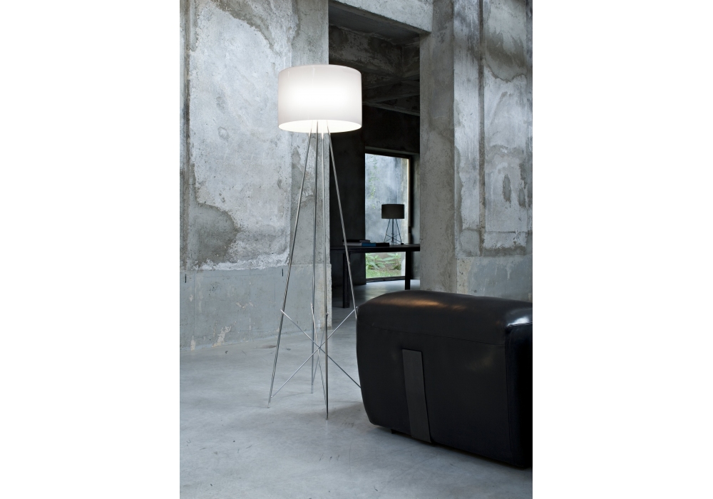 Ray F2 conçu par Rodolfo Dordoni pour Flos est un lampadaire d'intérieur à lumière diffuse. Sa structure est en tube d'acier chromé. Le support du diffuseur est en alliage de zamak moulé sous pression, poli et chromé. Le couvercle de la douille est en nylon blanc moulé par injection. Le diffuseur interne est en polycarbonate opale moulé par injection. Les pieds sont en PVC élastique transparent moulé par injection. Les diffuseurs sont en tôle d'aluminium tournée, peinte en blanc à l'intérieur et en blanc brillant ou noir brillant à l'extérieur, ou en verre soufflé bouche gris, avec finition extérieure brillante. Le câble est équipé d'un variateur électronique. Ampoule non incluse.
