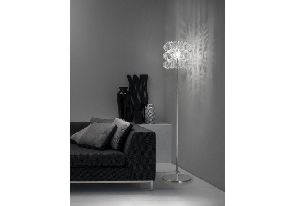 Ecos conçu par Renato Toso, Noti Massari & Associati pour Vistosi est un lampadaire avec base circulaire et tige verticale en métal peint. Le diffuseur est structuré par une série d'éléments circulaires en cristal placés côte à côte et abritant une source lumineuse LED ou halogène avec douille E27. Ecos est disponible en différentes finitions.