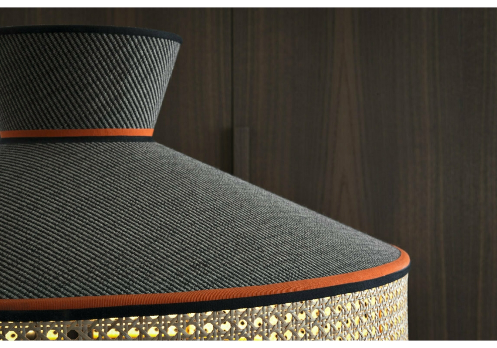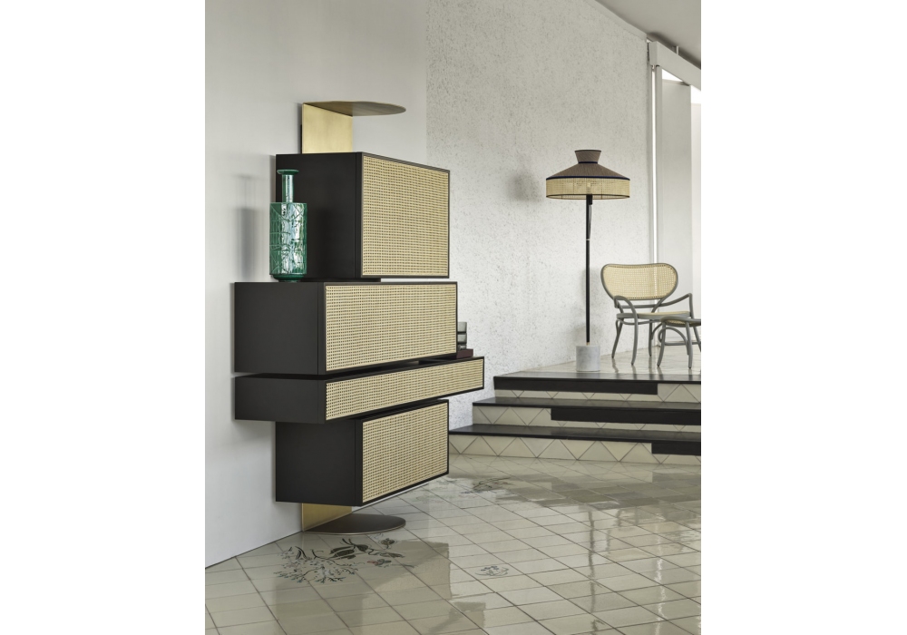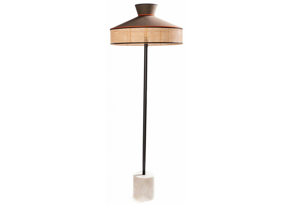 Wagasa conçu par Gebrüder Thonet Vienna est un lampadaire avec base en marbre de Carrare et tige en bois de hêtre laqué noir. Abat-jour en tissu, disponible en différentes versions. Inserts en paille de Vienne.
