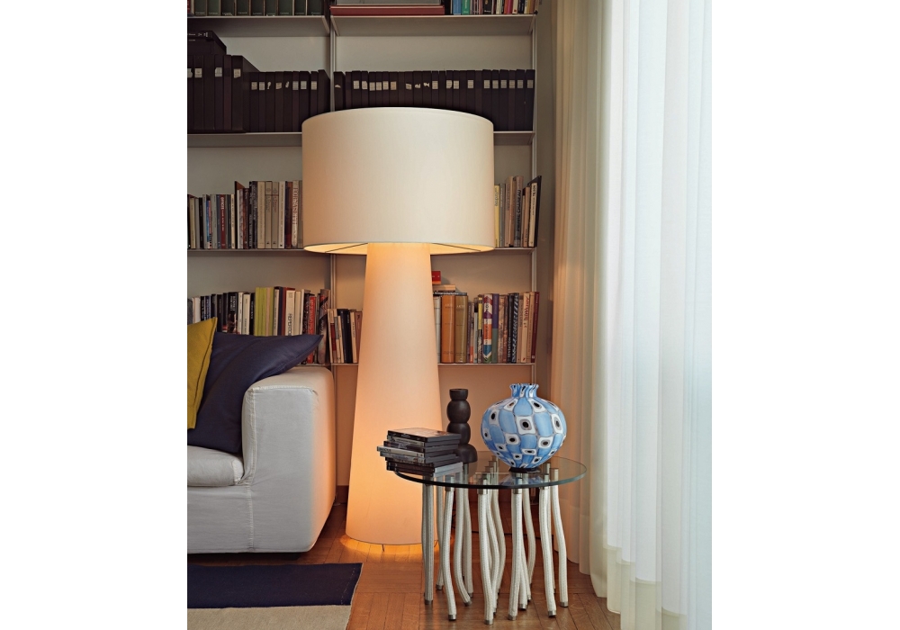 Big Shadow conçu par Marcel Wanders pour Cappellini est un lampadaire réalisé avec une structure en tige de métal peint chromé et un revêtement en polyamide et viscose blanc. Disponible en différentes dimensions.