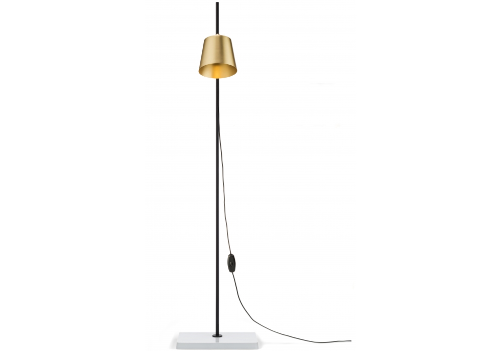 Lab Light conçu par Anatomy Design pour Karakter est un lampadaire avec diffuseur en laiton brossé, laqué transparent, tige en acier peint et base en porcelaine blanche. Alimentation avec fiches interchangeables (EU / UK / AU) incluse.