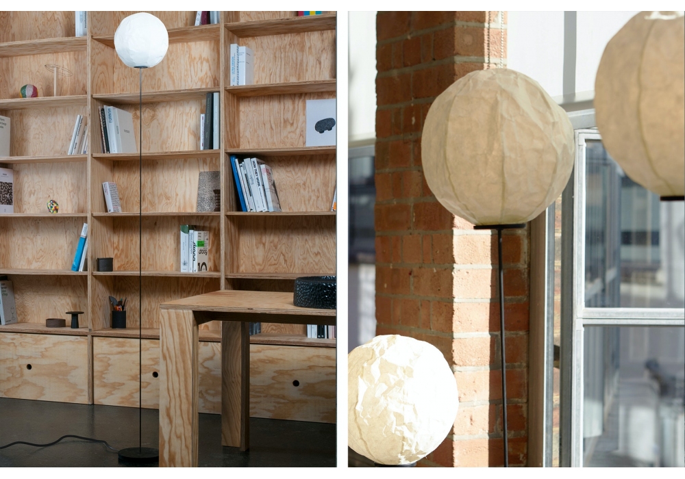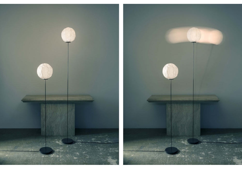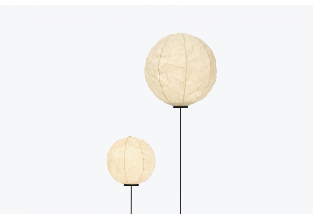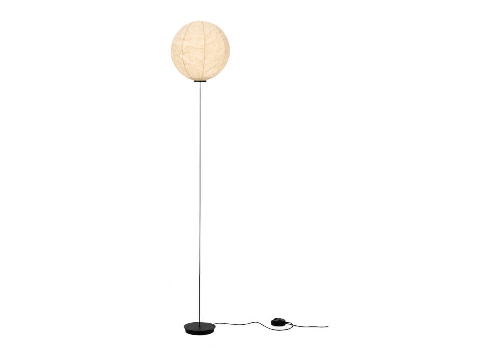 Cho Light conçu par Dimitri Bähler pour Established & Sons est un lampadaire, l'abat-jour est en papier japonais Washi monté magnétiquement sur une tige flexible en fibre de carbone. Câble PVC noir L1500mm et interrupteur au pied réglable en continu. Disponible en quatre variantes.