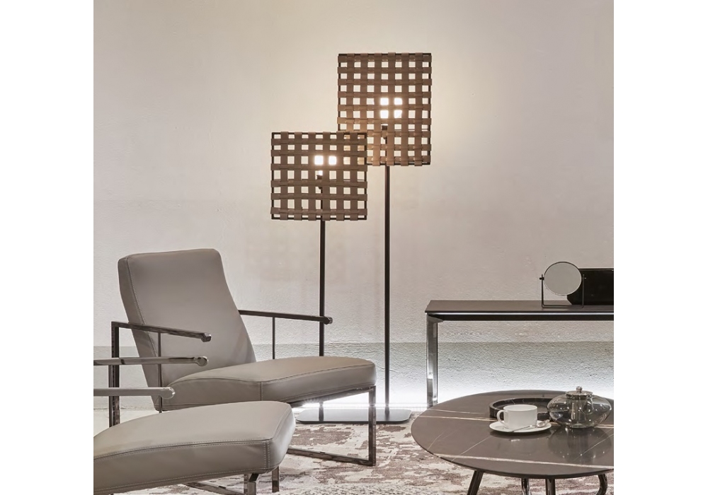 Royal conçu par Archirivolto pour Dema est un lampadaire composé d'une structure en métal peint et d'un abat-jour en cuir tressé à lumière dimmable.