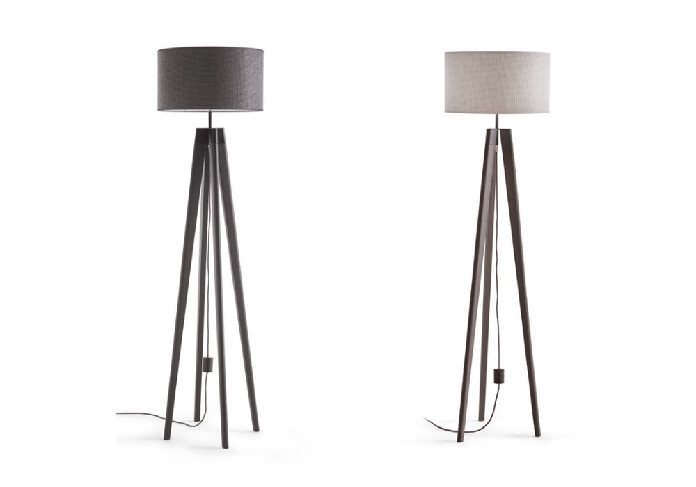 Edgar conçu par Carlo Bimbi pour Dema est un lampadaire avec abat-jour en tissu et pvc. Fabriqué avec une structure en métal laqué marron foncé et des pieds en frêne teinté dans différentes finitions. Disponible avec 3 ou 4 jambes.