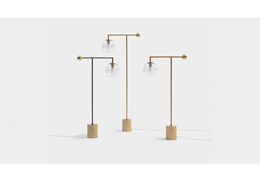 Bardot conçu par Laura Cazzaniga et Ilaria Limonta pour Bonaldo est un lampadaire avec abat-jour en verre transparent, structure en métal peint en différentes finitions, base et sphère en métal couleur laiton mat. Disponible en 2 tailles.