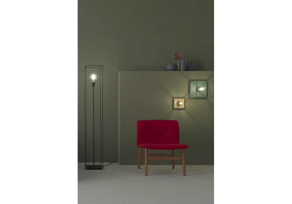 Box conçue par Franco Zavarise pour Zava est une lampadaire en fer. La source lumineuse est située à l'intérieur d'un cadre métallique qui met en valeur ses formes. Disponible en différentes finitions.