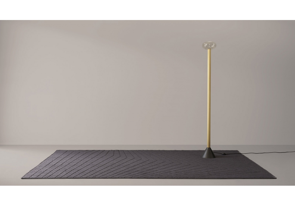 Milù conçu par Pianca est un lampadaire réalisé avec un capuchon en verre transparent ou opale et une structure tubulaire moletée. Disponible en différentes finitions.